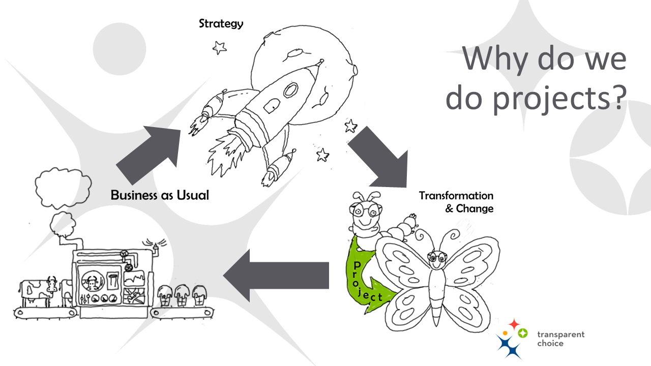 So, the obvious insight I wanted to pull out is that projects exist to transform STRATEGY into CHANGE that improves BAU. The project creates outcomes that take you towards achieving your STRATEGY.